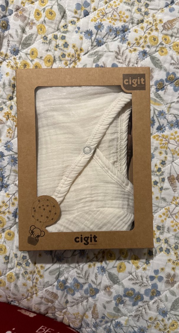 Yumuşak kumaştan yapılmış, çıtçıtlı kapanışlı beyaz baskılı Cigit bebek önlüğü, rahat kullanım sağlar.