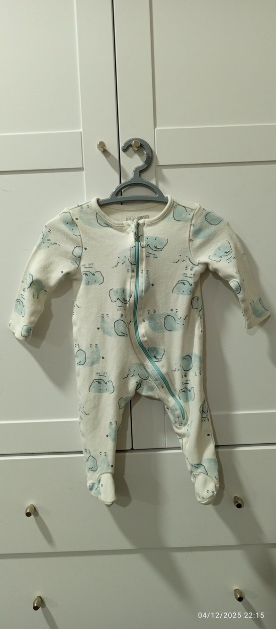 Beyaz renkli, uzun kollu, fermuarlı ve baskılı desenli yumuşak ve sıcak dokulu bebek tulumu.