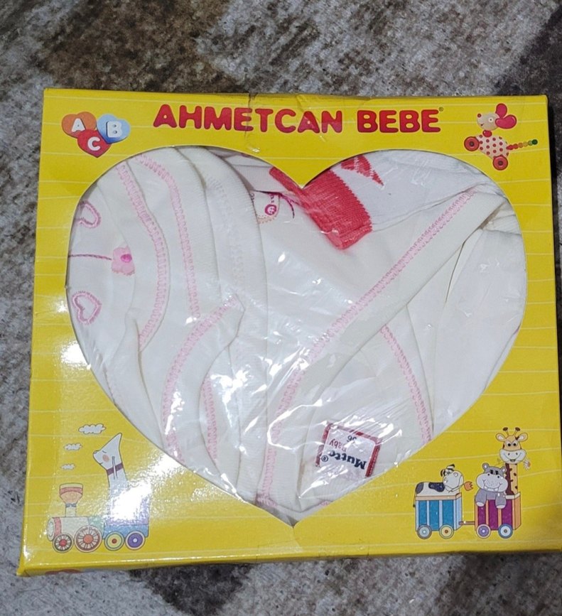 Renkli baskılı desenlere sahip beyaz bebek zıbın takımı, üzerinde "AHMETCAN BEBE" yazısı bulunur. Yumuşak kumaştan üretilmiştir.