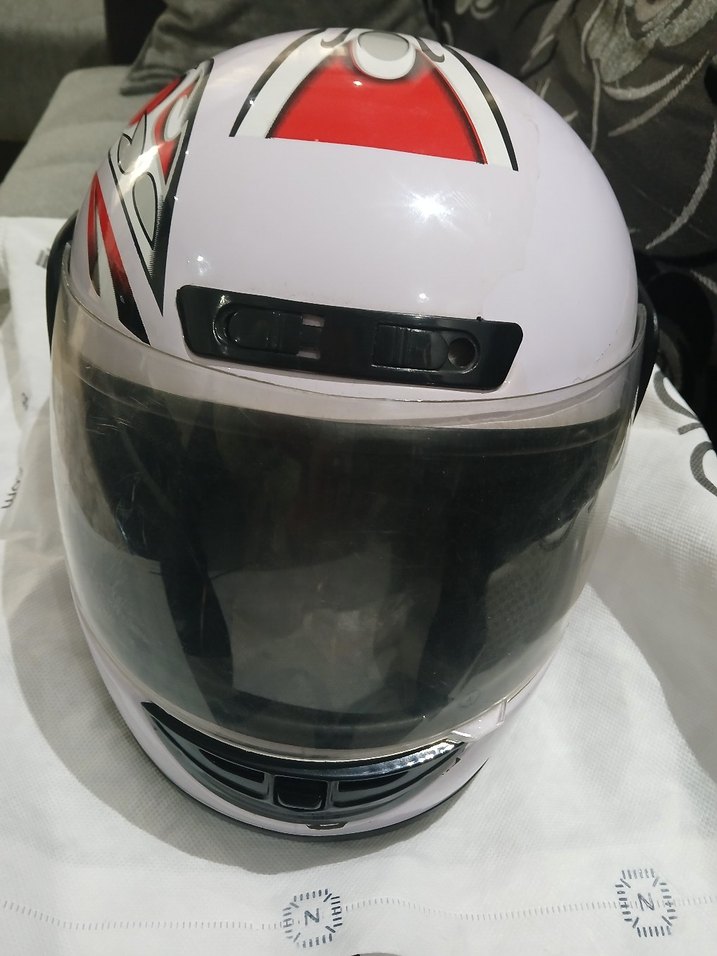 Baskılı beyaz plastik biker kask, tokalı ve şeffaf vizörlü. Sokak stiline uygun.oğlum motoru sattığı için satıyorum çok az kullanıldı