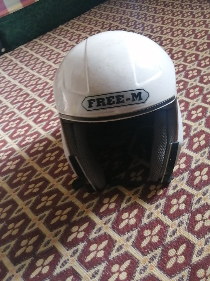 Beyaz baskılı, tokalı biker motosiklet kaskı. Önünde "FREE-M" yazısı ve gri detaylar bulunur. Plastik malzemeden üretilmiştir. ️ görüldü gibi