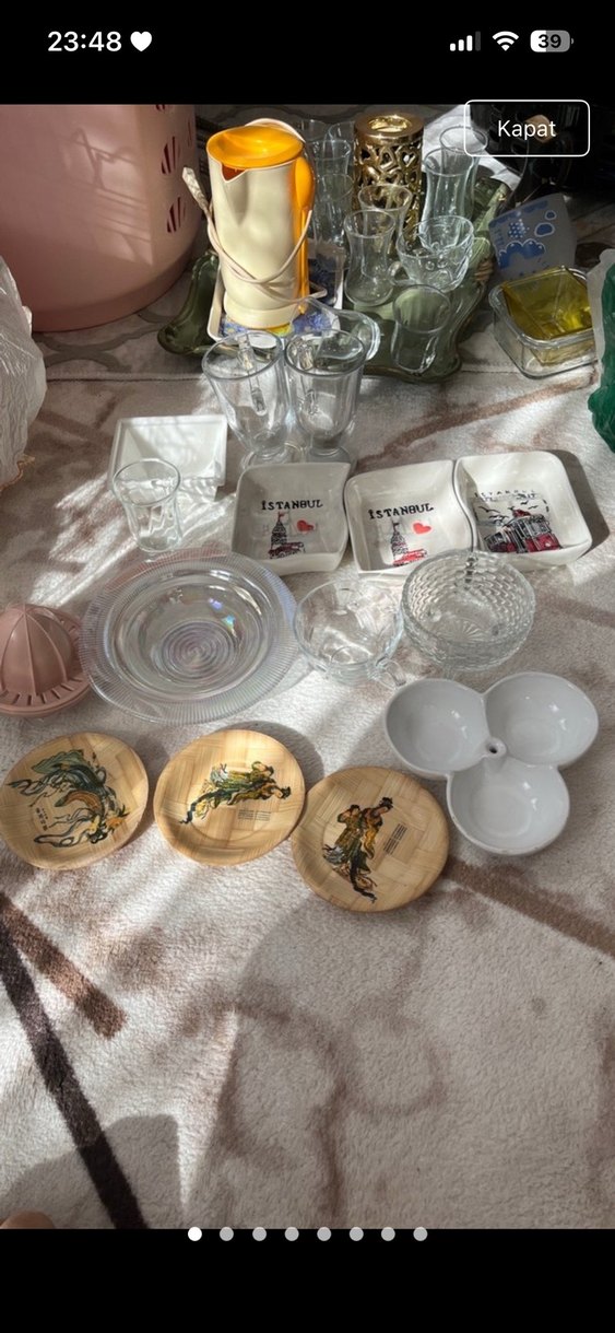 Baskılı İstanbul desenli beyaz seramik tabak ve kaseler, bohem tarzda. Şeffaf cam eşyalar ve sanatsal baskılı ahşap tabaklar içerir.