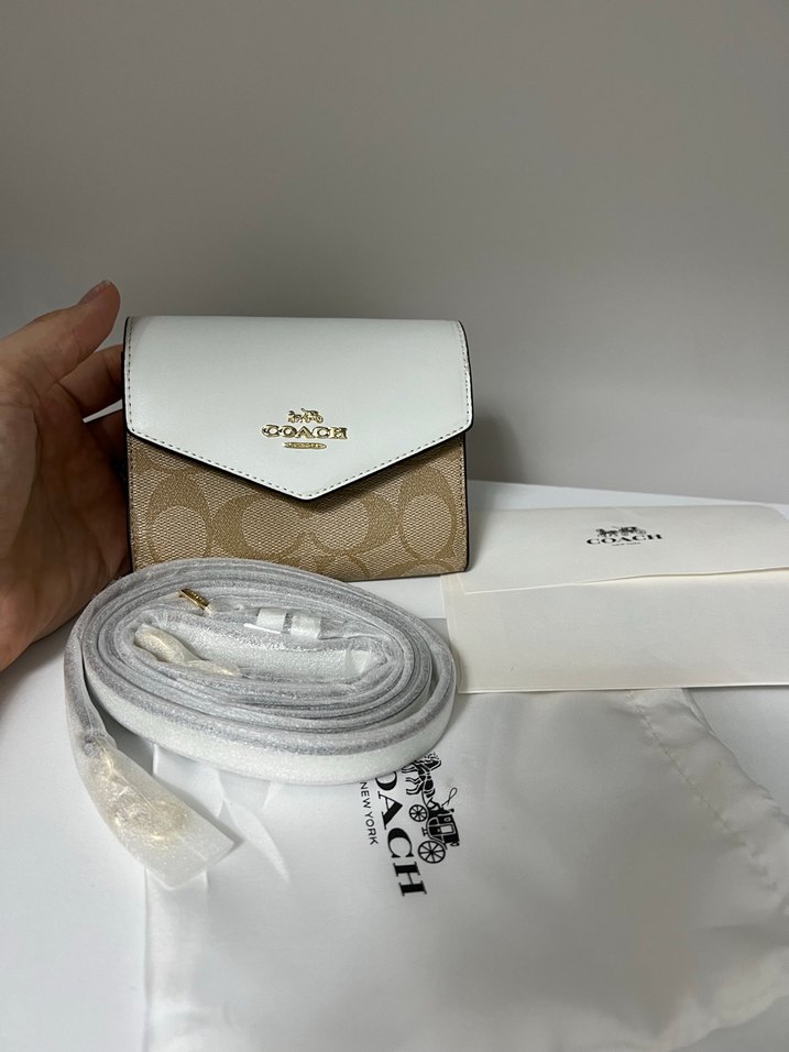 Beyaz ve bej tonlarında baskılı Coach çocuk cüzdanı ve kemer seti, bel detaylı ve trend sokak stili için uygun.