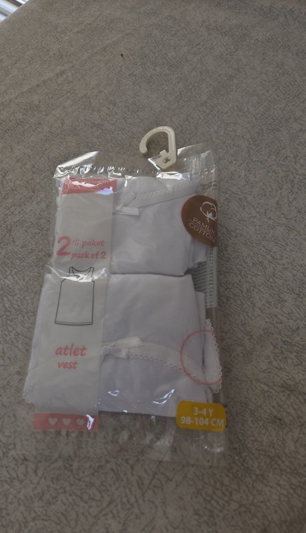 3-4 yaş (98-104 cm) çocuklar için beyaz baskılı pamuklu atlet. İki adet pakette sunulur.