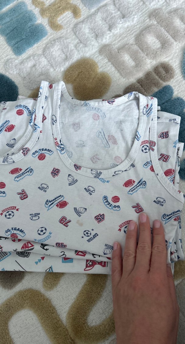 Beyaz renkte, çeşitli spor simgeleri ve sayılarla baskılı desenli çocuk atletidir. Yumuşak kumaştan üretilmiştir, rahat kullanım sağlar. ⚽ 5-6 yas, 4 adet. Bazilari hafif lekeli.