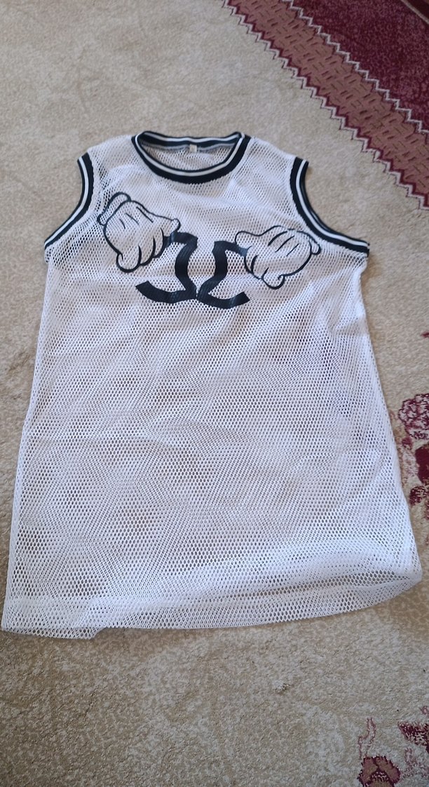 Beyaz, parlak baskılı desenli, siyah detaylı çocuk atleti. Rahat ve nefes alan kumaş.
