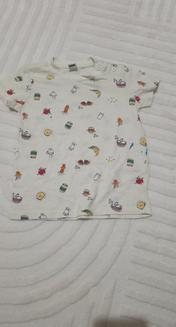 Beyaz renkte, eğlenceli baskılı desenlere sahip çocuk atleti. Omuzda düğme detayı ve hafif rahat kumaş içerir.