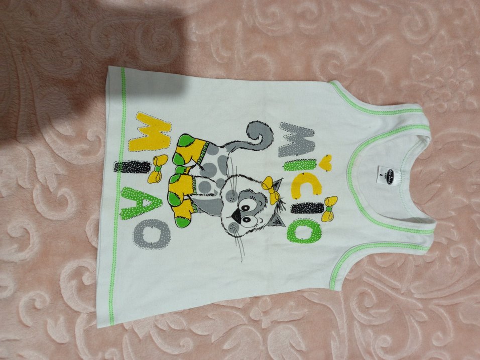 Beyaz çocuk atleti, renkli baskılı kedi deseni ve 'MIAO' yazısıyla. Kenarlarında açık yeşil detaylar bulunur.