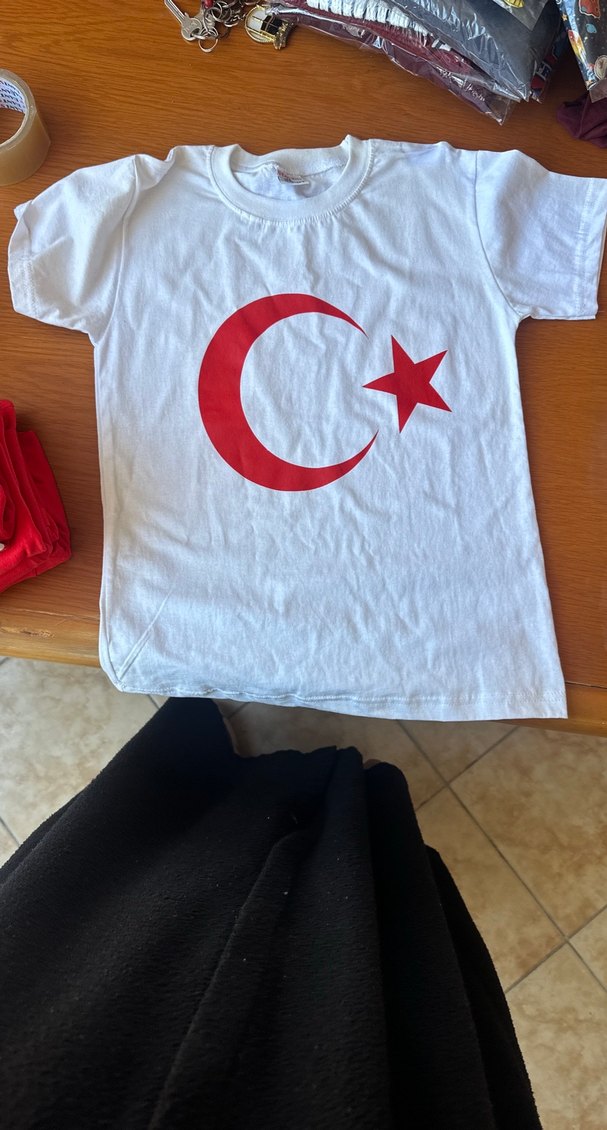 Önünde parlak kırmızı hilal ve yıldız baskısı olan beyaz çocuk atleti. Rahat ve sade tasarım.