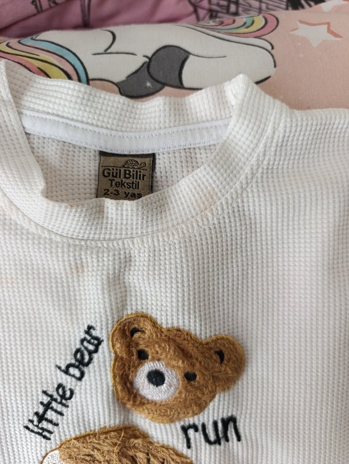 2-3 yaş çocuklar için yumuşak kumaştan yapılmış, ayıcık ve "run" yazısı baskılı beyaz çocuk atlet. bir kaç yerinde leke var çıkar mı bilmiyorum ama göze çarpmıyor.