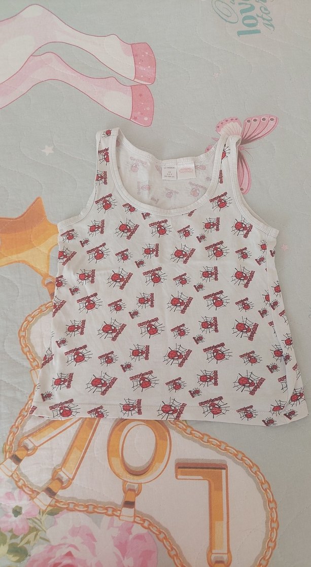 Beyaz zemin üzerine küçük kırmızı ve siyah renkli baskılarla süslenmiş, kolsuz ve yumuşak kumaştan yapılmış çocuk atleti.