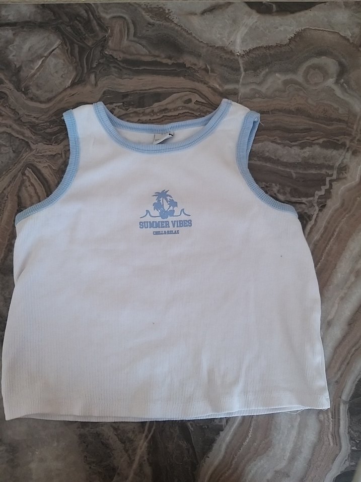 Beyaz renkli, açık mavi detaylı çocuk atleti. Ön kısmında yaz temalı baskı bulunur. Rahat ve günlük kullanım için uygundur.