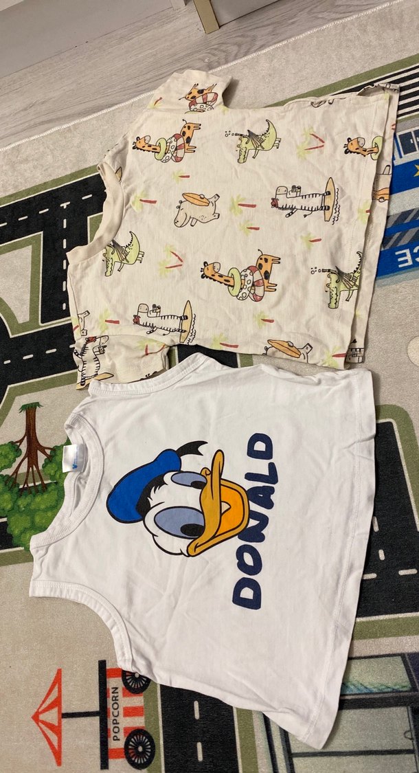 Birinde hayvan desenleri, diğerinde büyük Donald Duck baskısı olan iki beyaz çocuk atleti. Her ikisi de kolsuz ve yumuşak kumaştan yapılmıştır.