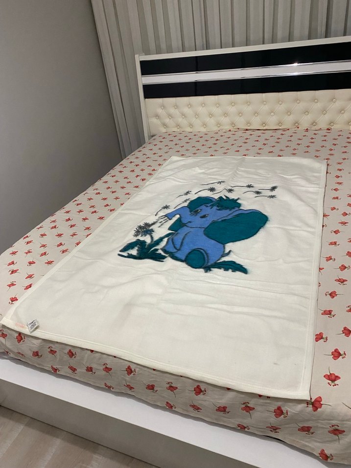 Beyaz renkte, baskılı desenli ve yumuşak, sıcak dokulu çocuk battaniyesidir. Boy:146 cm genişlik:94 cm