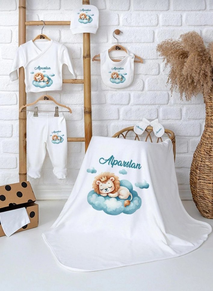 Pastel tonlarda beyaz, yumuşak baskılı çocuk battaniyesi. Bulut üzerinde yatan aslan ve 'Alparslan' ismi işlenmiştir. Çocuklar için konforlu ve yumuşak. istenilen her isim yazılır