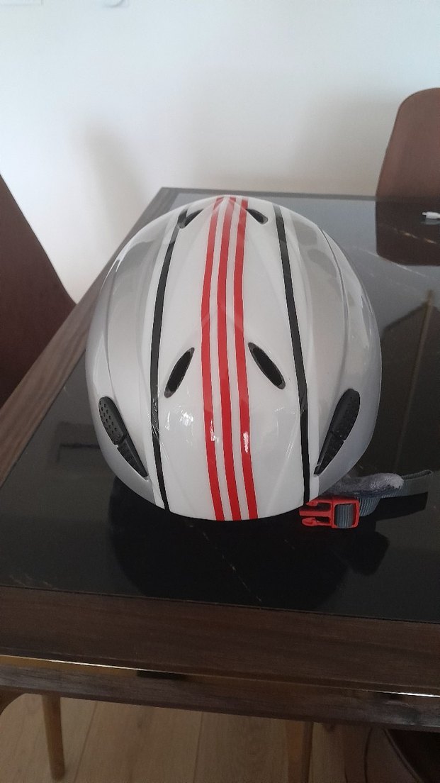 Beyaz baskılı, gri ve kırmızı çizgili çocuk kask.Velcro kayışlı, dayanıklı plastik malzemeden üretilmiştir. ️