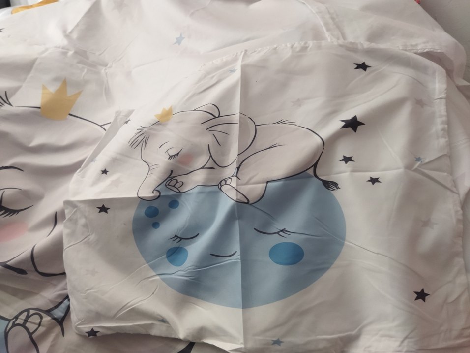 Yumuşak sentetik kumaştan yapılmış, beyaz zemin üzerine pastel renklerde uyuyan fil ve ay baskılı çocuk nevresim ve yastık kılıfı seti.