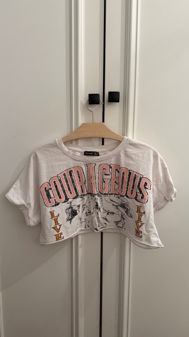 Beyaz pamuklu tişört, kısa kollu ve yuvarlak yaka. Baskılı 'COURAGEOUS' yazısı ve tokalı detayla rahat ve trend görünümlü.