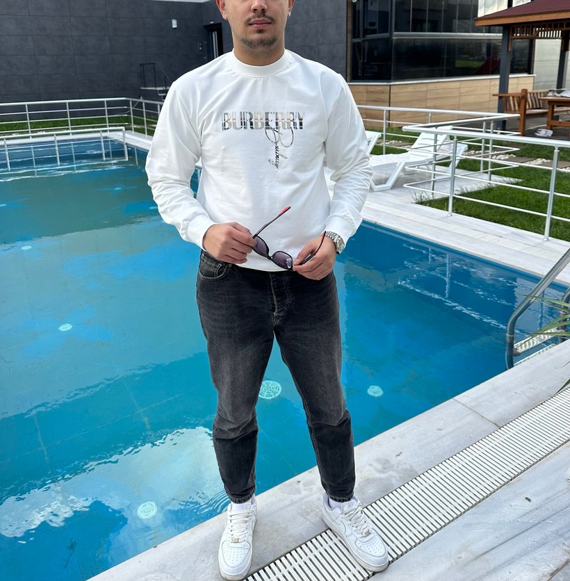 Beyaz renkte, baskılı gri desenli denim kumaştan yapılmış, uzun kollu ve bisiklet yakalı erkek sweatshirt. Rahat kesimi ve günlük kullanıma uygun uzunluğu ile zahmetsiz şıklık sunar. S-M-L-XL-XXL tüm bedenler mevcut Manken beden ‘L’ boy:1,83 kilo:80