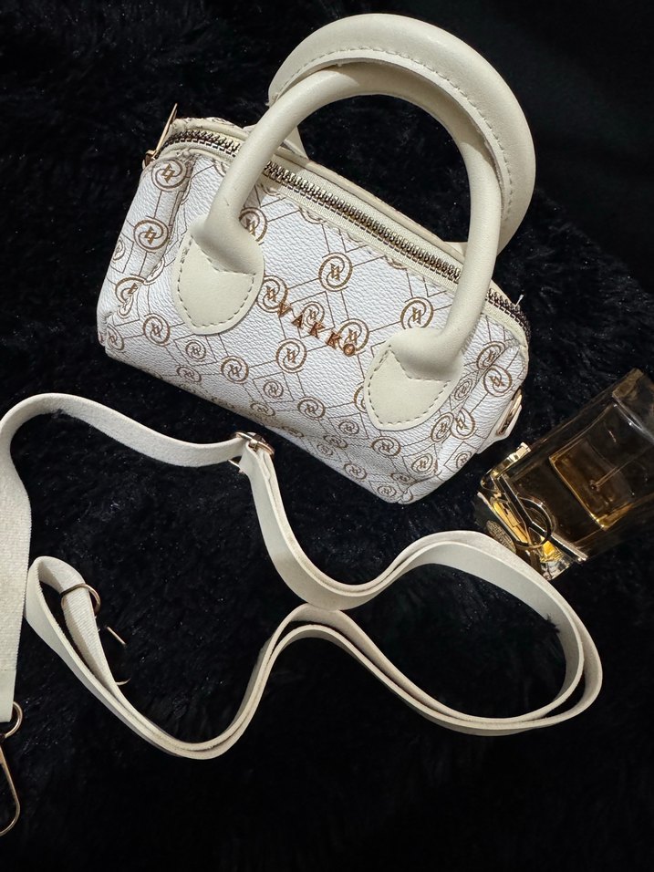 Beyaz renkli, baskılı desenli deri kadın çantası. Kemer detaylı ve günlük kullanıma uygun, klasik şıklık ve Paris sokak stilini yansıtıyor.