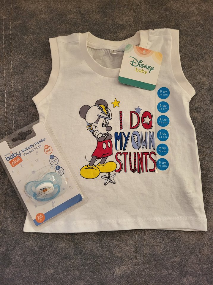 Beyaz renkli, renkli baskılı Disney karakterli bebek atlet, 9 ay 74 cm beden. 'I DO MY OWN STUNTS' yazılı.