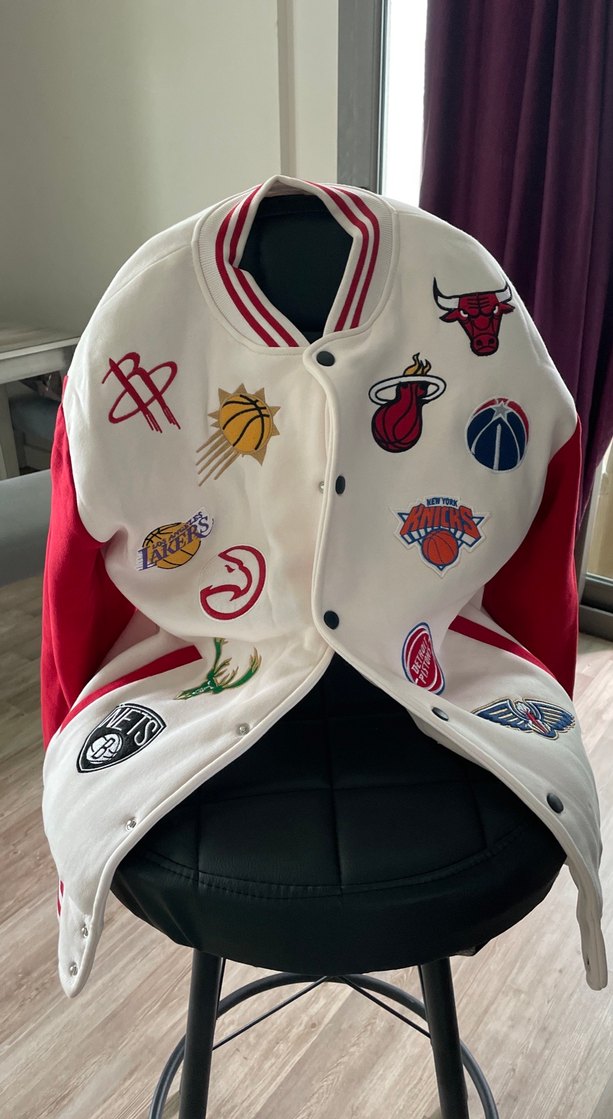 Beyaz renkte, baskılı spor logolarıyla süslenmiş, düğmeli, uzun kollu, yuvarlak yakalı ve bol kesim kadın bomber cekettir. Parlak yüzeye ve yumuşak, sıcak kumaşa sahiptir.