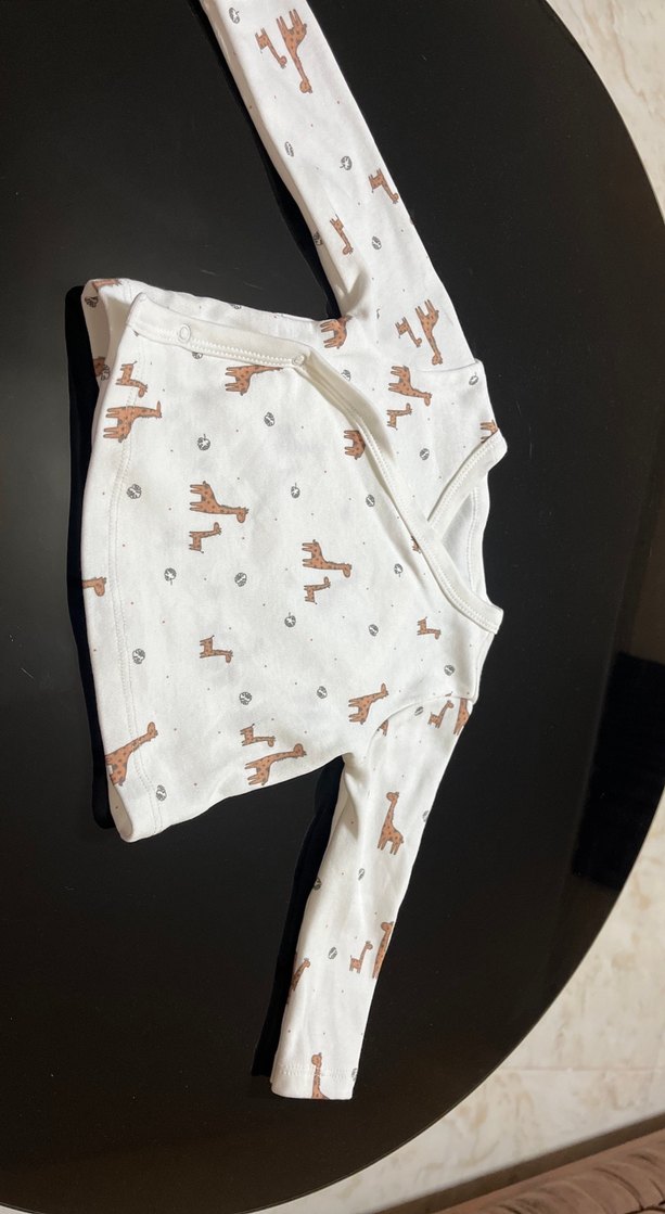 Beyaz pamuklu, baskılı zürafa desenli, düğmeli, V yaka, uzun kollu, midi boy bebek hırkası.