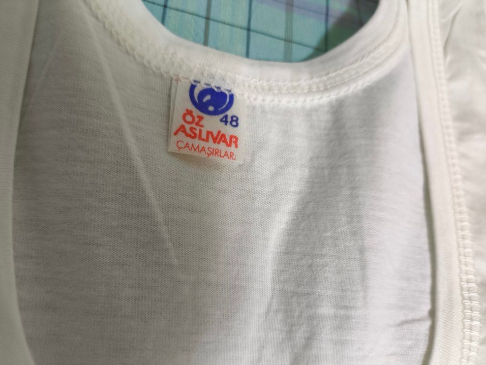 Baskılı desene sahip beyaz çocuk atleti, 48 beden, Öz Aslıvar etiketli. Rahat ve yumuşak kumaş.