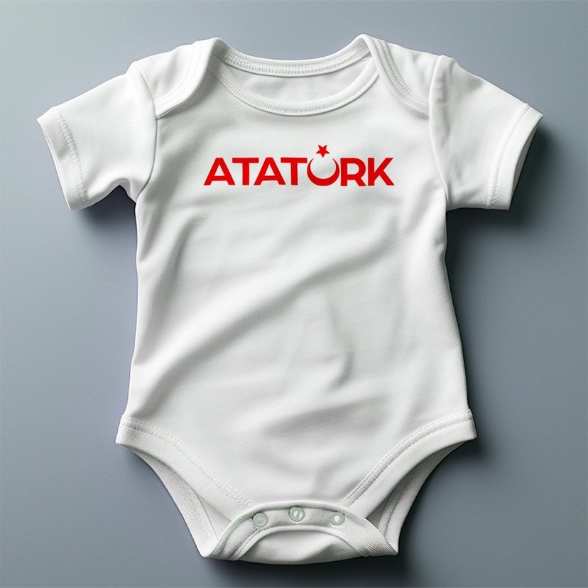 Beyaz, kısa kollu erkek bebek body, önünde renkli "ATATÜRK" baskısı bulunur. Sentetik, yumuşak kumaştan, bisiklet yaka ve çıtçıtlı alt kısmı vardır.