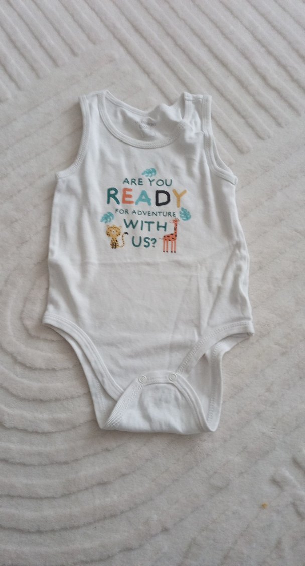 Beyaz pamuklu kolsuz body, renkli baskılı macera temalı desen ve yuvarlak yaka ile rahat kullanım sağlar.