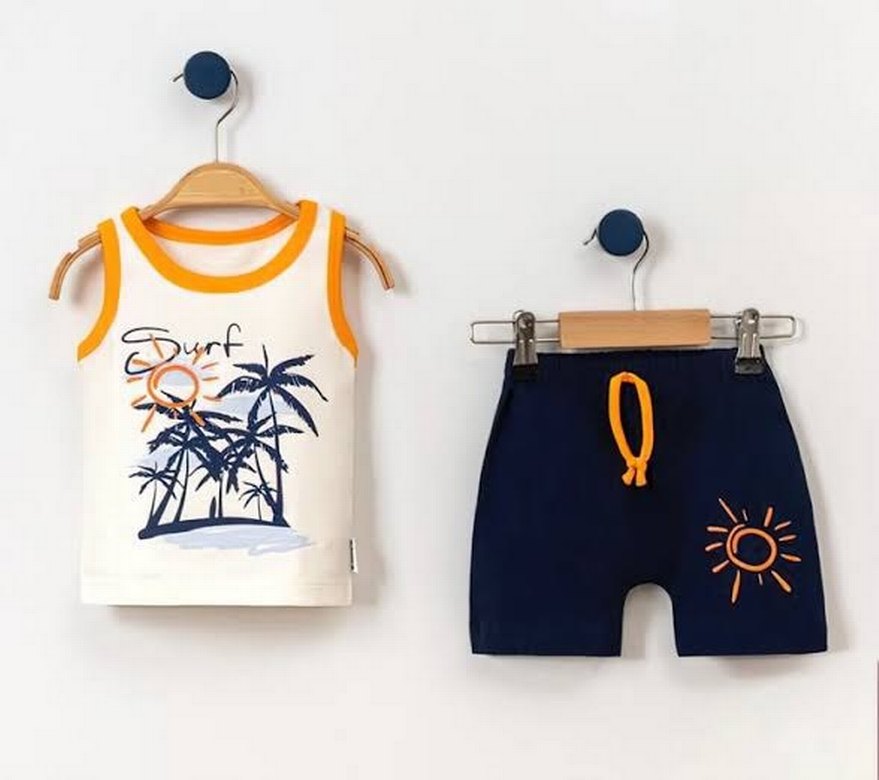 Pamuk kumaştan, kolsuz beyaz üstü baskılı ve bisiklet yakalı, turuncu detaylı lacivert şortlu erkek bebek takım
