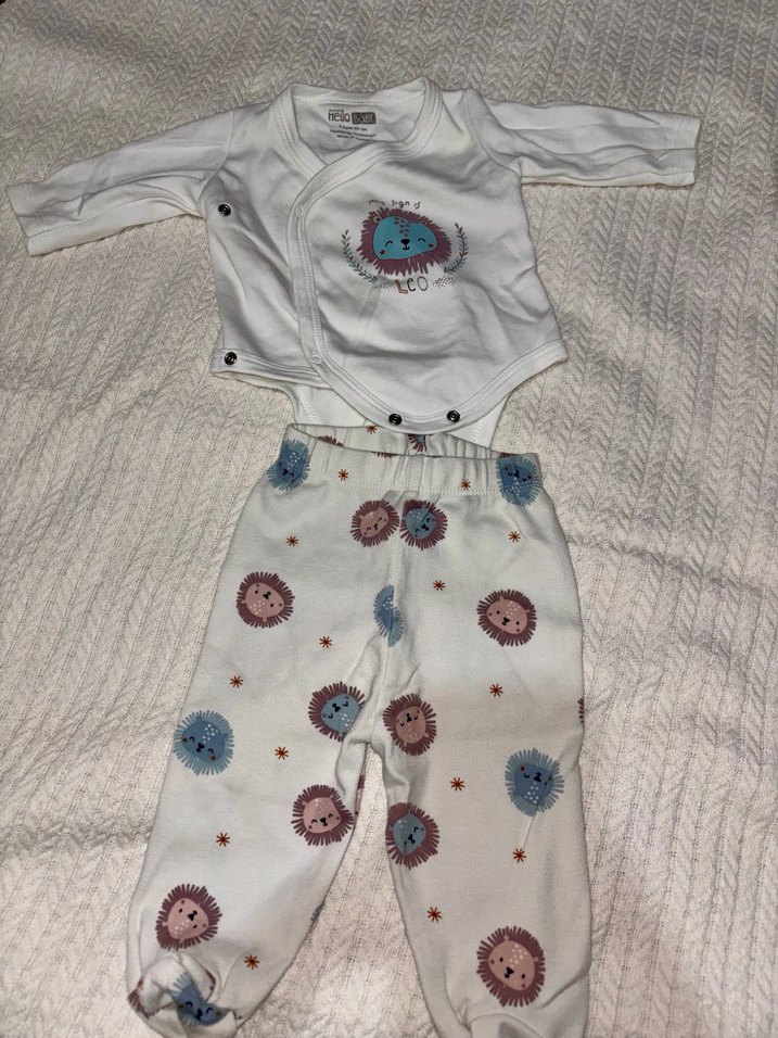E bebek ürünü Uzun kollu, düğmeli, bisiklet yaka örme üst ve aslan desenli baskılı pantolondan oluşan beyaz bebek erkek takımı. Hafif renkli, rahat sokak stili. Bebeğim sadece 1 kez giydi