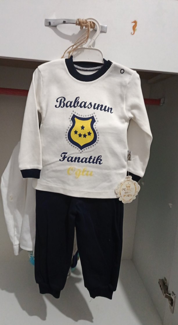 Beyaz uzun kollu üst, baskılı yazı ve arma detaylı, koyu renk pantolonla takım. Örme yuvarlak yaka ve yumuşak kumaş rahatlık sağlar.