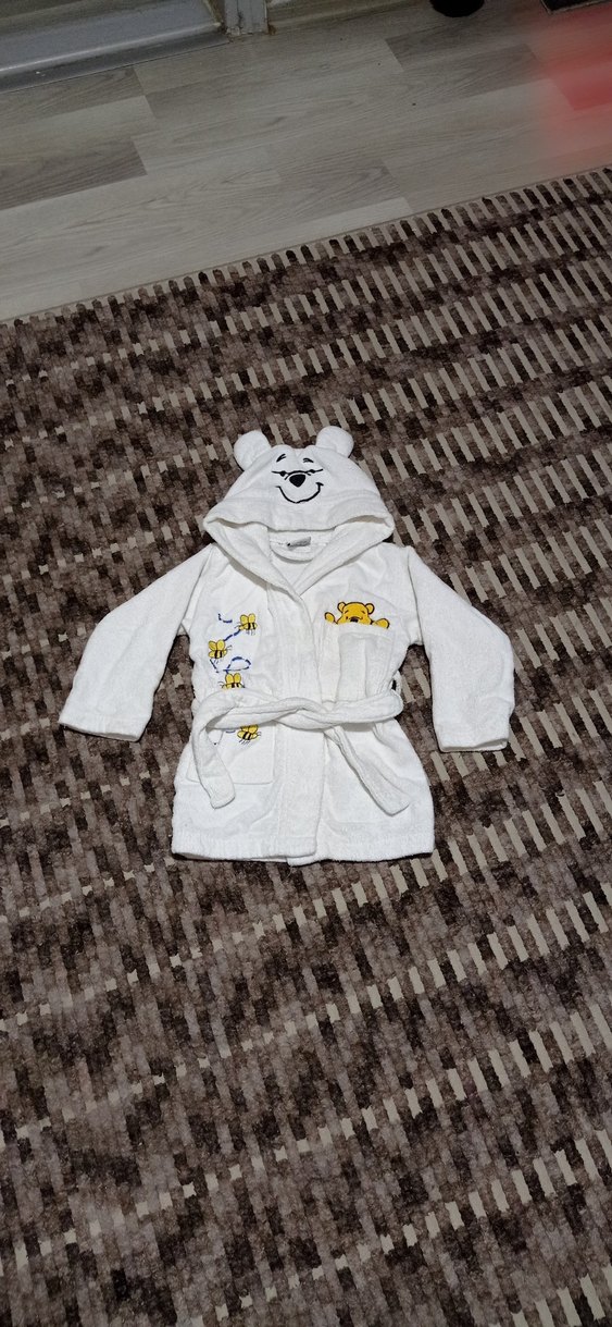 Beyaz renkli, baskılı desenli erkek çocuk bornozu, kulaklı kapüşon ve bağlama kemerli az kullanıldı sorunsuz ürün