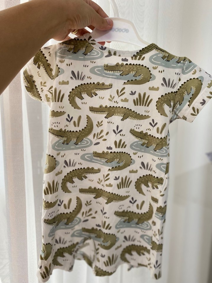 Yumuşak kumaştan, beyaz zemin üzerine baskılı sevimli timsah desenli çocuk tulumu. Hafif ve rahat kullanıma uygun.