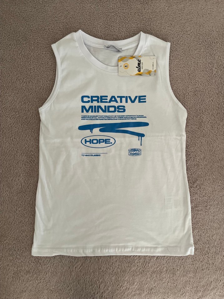 Beyaz renkli, pamuk kumaştan, kolsuz erkek çocuk tişörtü. Önünde 'CREATIVE MINDS HOPE' yazılı baskı bulunur. Salaş kesimi ve bisiklet yaka tasarımıyla rahat bir sokak stili sunar.
