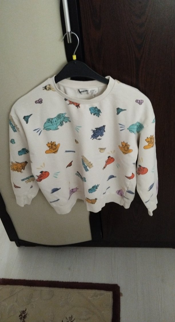 Beyaz renkli, uzun kollu, rahat kesim erkek çocuk sweatshirtü. Yumuşak, örgü görünümlü fleece kumaştan, renkli baskılarla süslenmiştir.