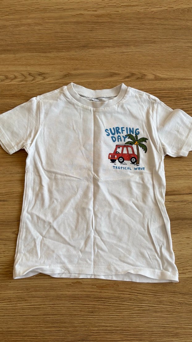 Pamuk kumaştan, kısa kollu ve yuvarlak yakalı beyaz erkek çocuk tişörtü. Renkli baskılı, bol kesim, sörf temalı tasarım içerir.