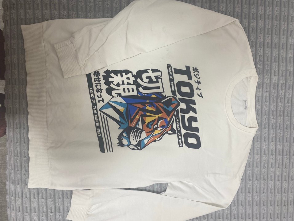 Beyaz renkli, uzun kollu, bol kesim erkek çocuk tişörtü. Önünde Tokyo ve kaplan baskısı bulunur. Kağıt dokulu yumuşak kumaştan, bisiklet yaka.