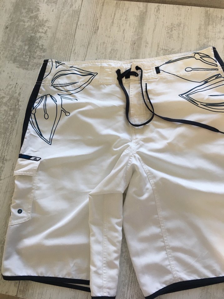 Beyaz renkli, baskılı desenli, bol kesim ve kemerli erkek midi şort. Plaj ve sokak stiline uygundur.