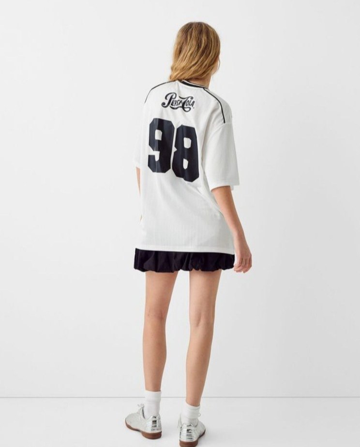 Beyaz, unisex baskılı, kısa kollu, yuvarlak yakalı, bol kesim erkek forması