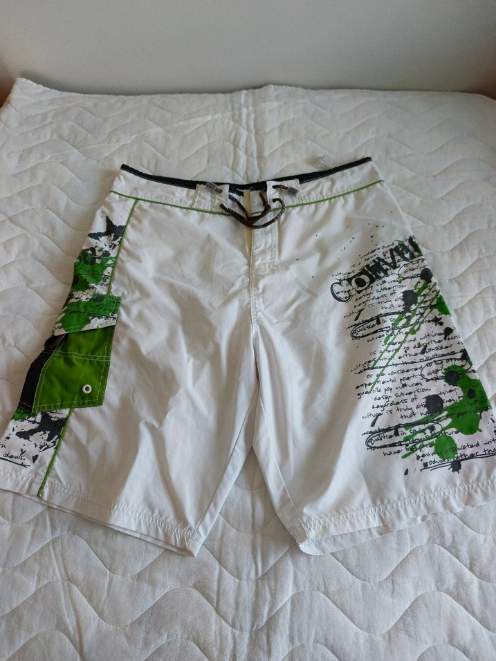 Beyaz renkli, bol kesim erkek mini şort, yeşil ve siyah baskılı desenlere sahip, kemerli ve plaj kullanımı için uygun. Arka kısımda hafif sarı leke var çıkar