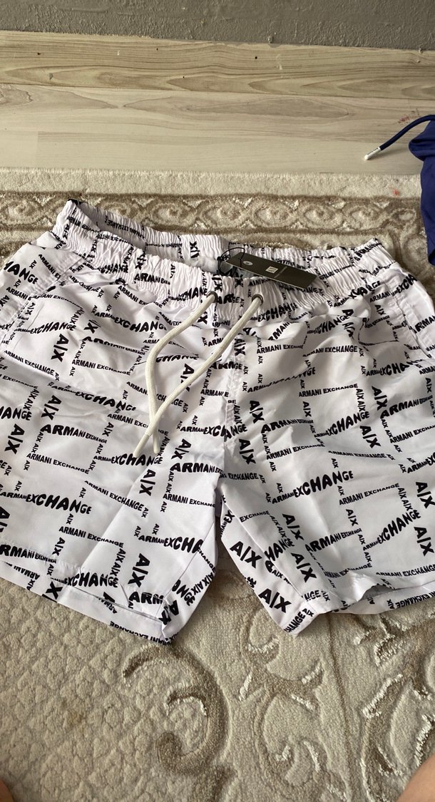 Sentetik kumaştan üretilmiş, siyah Armani Exchange baskılı beyaz, bol kesim erkek mini şort. Plaj için rahat ve şık bir seçim.