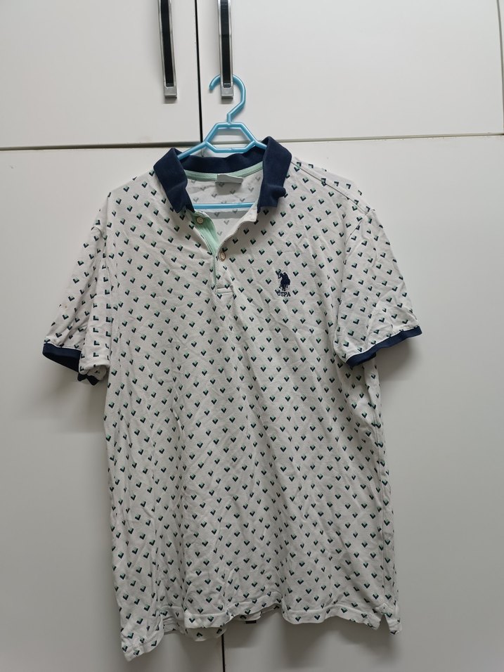 Kısa kollu, düğmeli yakalı pamuklu beyaz erkek polo tişört. Gevşek kesim, küçük baskılı desenler ve koyu renk yaka-kol uçlarıyla günlük sokak stili için uygundur.