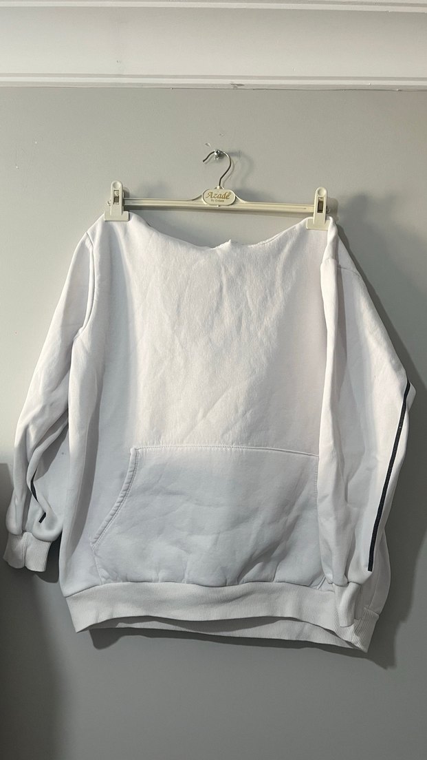 Beyaz renkte, uzun kollu ve salaş kesime sahip kadın sweatshirt. Önünde 'DESIKABLE' ve 'SHAPE' baskıları bulunur. Rahat ve şık sokak stili için uygun.