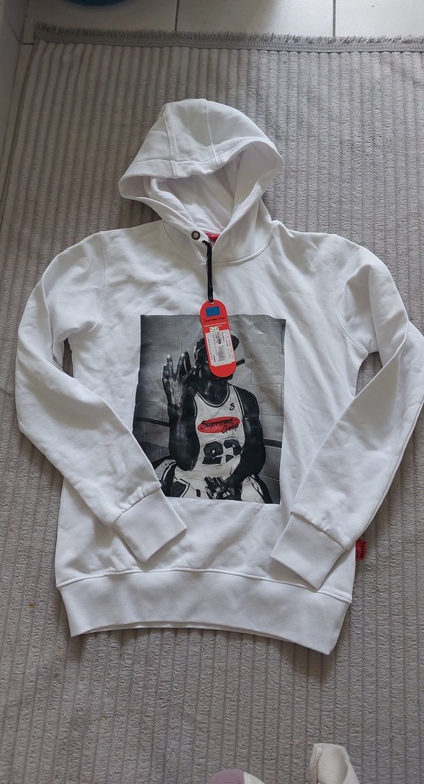 Beyaz renkli, baskılı erkek sweatshirt kapüşonlu ve uzun kolludur. Fitted kesim ve yumuşak . Günlük kullanıma uygundur. ÖLÇÜLERİ İKİ KOL ARASI 49 CM BOY 66 CM