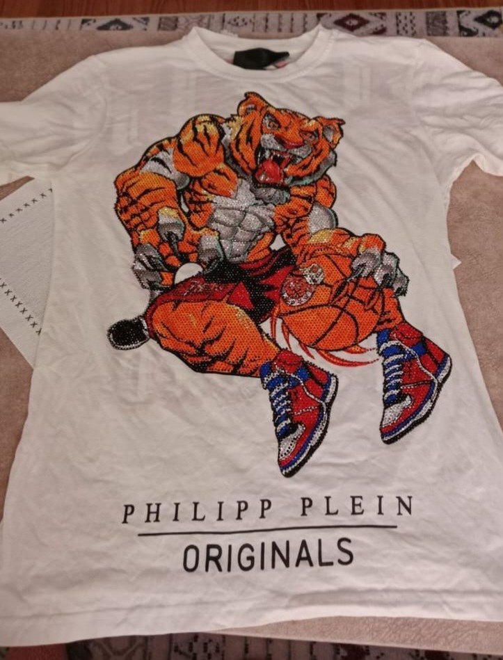 Beyaz, baskılı ve bol kesim erkek tişörtü. Kısa kollu ve bisiklet yaka tasarıma sahip. Önünde basketbol oynayan kaplan grafiği ve "PHILIPP PLEIN ORIGINALS" yazısı bulunur.