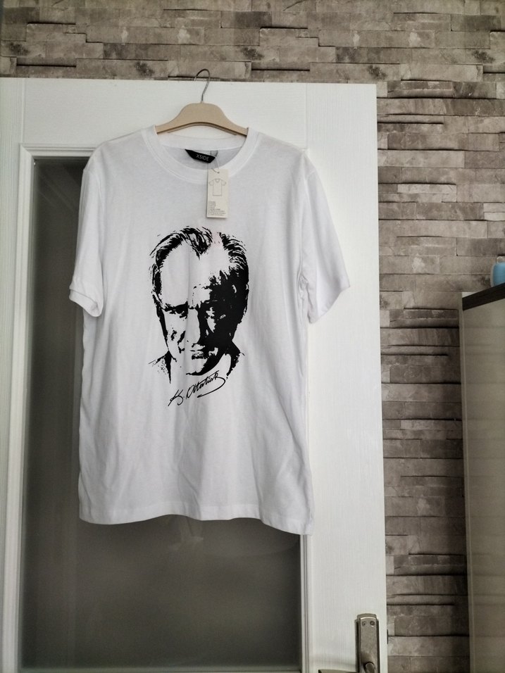 Beyaz, pamuklu, kısa kollu erkek tişörtü, önünde baskılı portre deseni bulunur. Salaş kesim ve yuvarlak yaka ile günlük kullanıma uygundur.