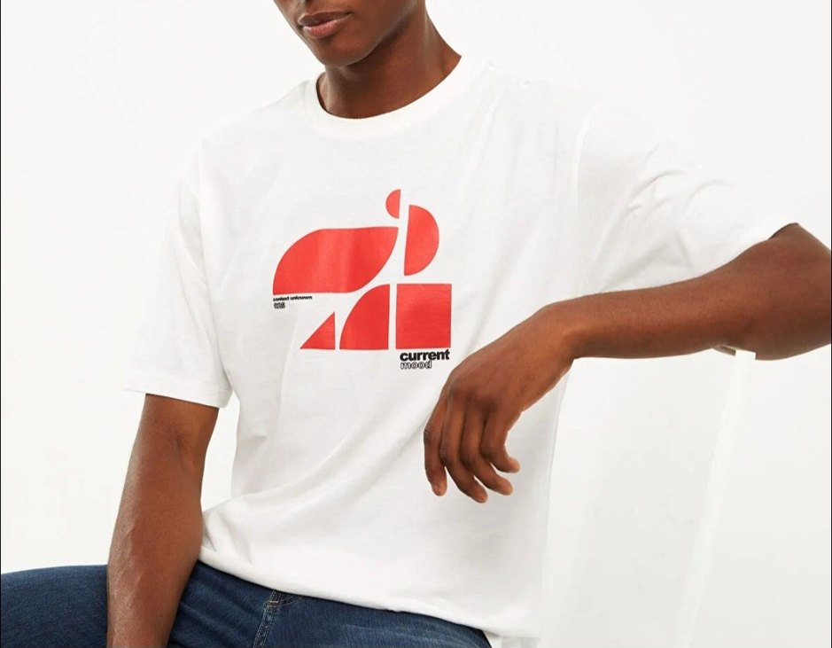 Beyaz renkli, kısa kollu ve yuvarlak yakalı erkek tişörtü. Pamuk kumaştan, bol kesim ve kırmızı baskılı 'current' yazısı bulunur. Günlük rahat stil için uygundur.