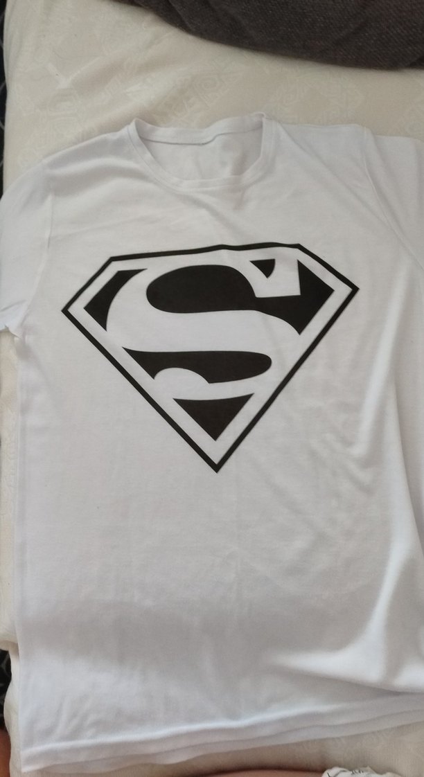 Beyaz parlak kumaştan, önünde büyük siyah baskılı amblem bulunan, kısa kollu ve bisiklet yaka, vücuda oturan erkek tişörtü.